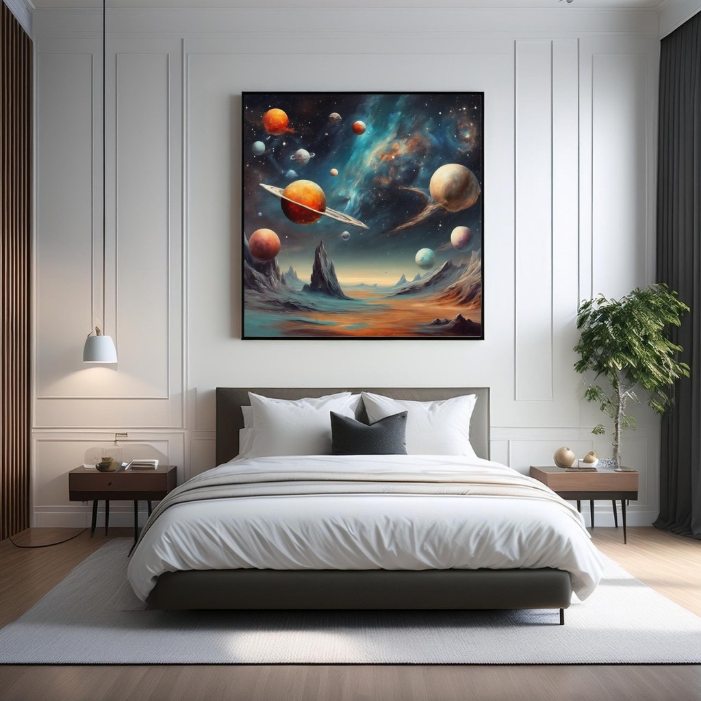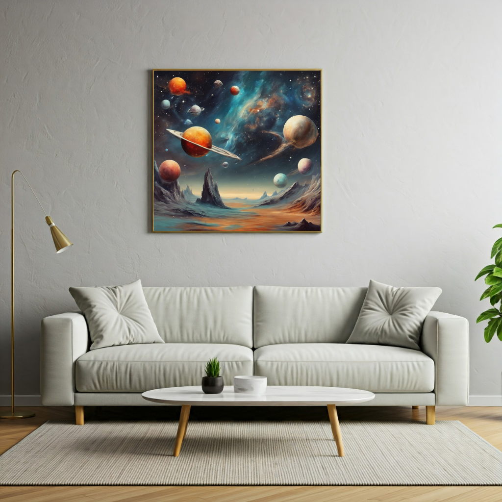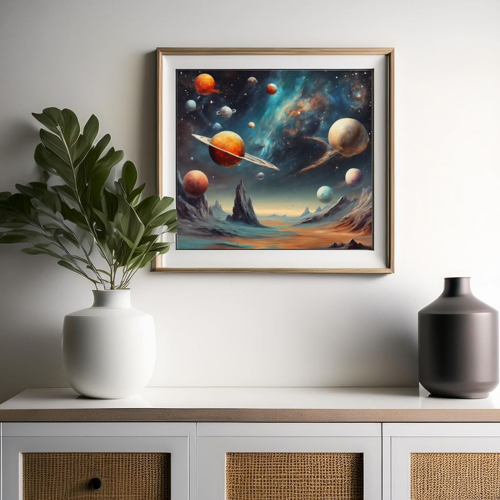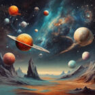 A mesmerizing cosmic landscape with multiple planets and celestial bodies.