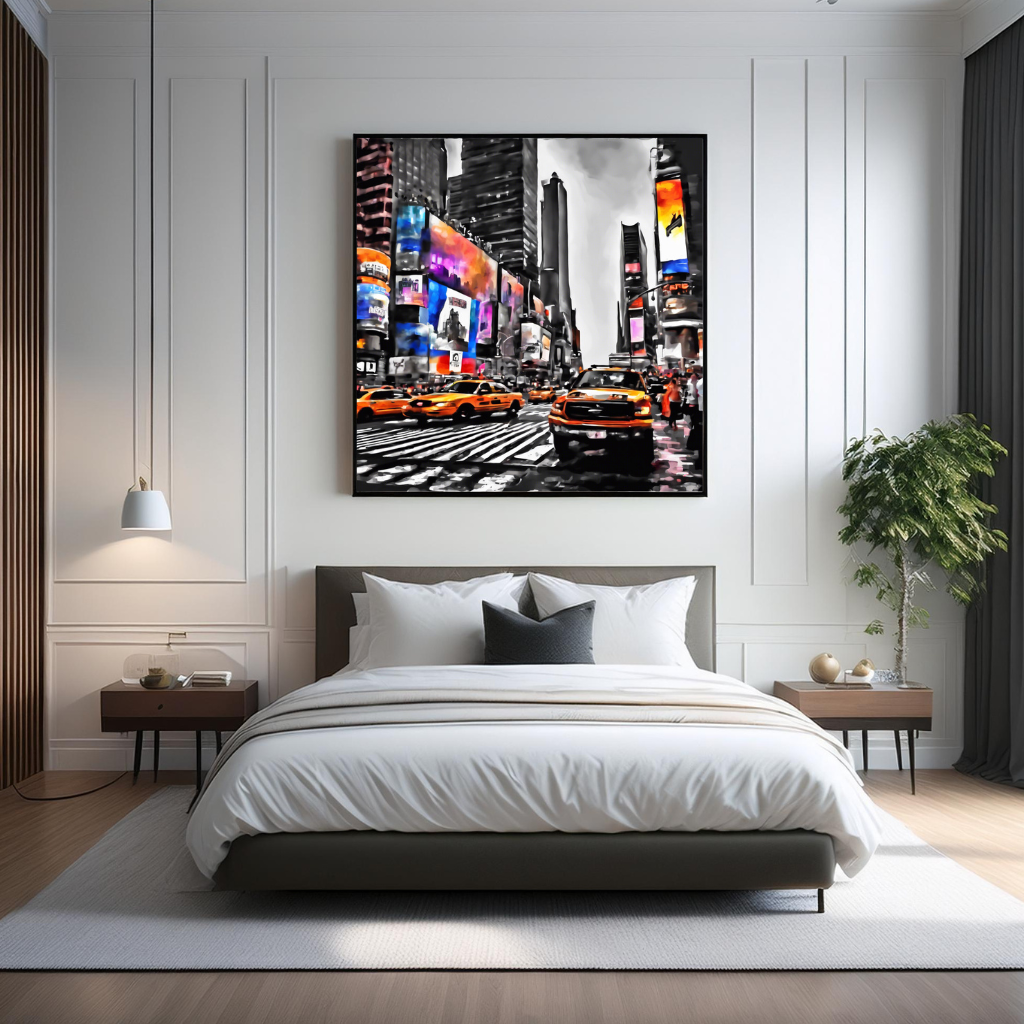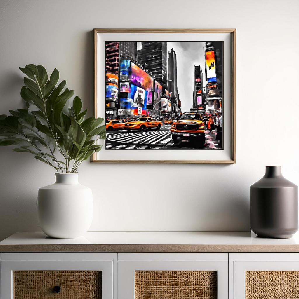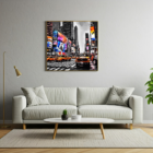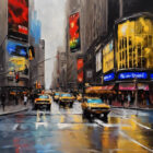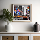 A bustling city street with vibrant billboards and yellow taxis.
