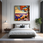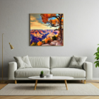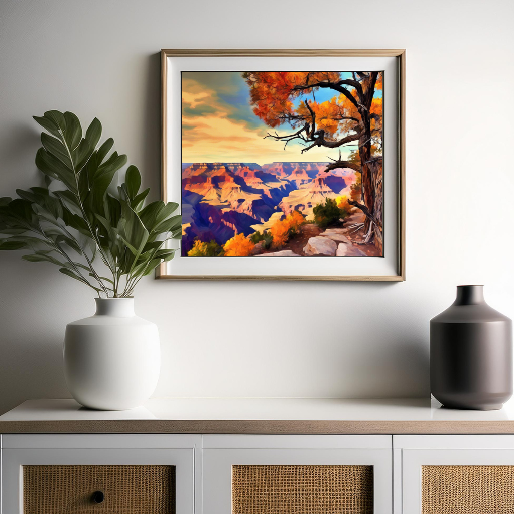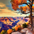 A lone tree frames the vibrant Grand Canyon in autumn.