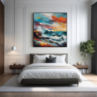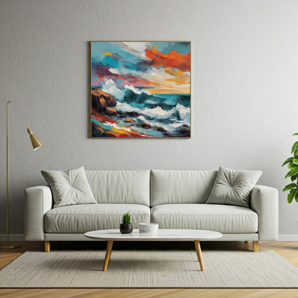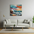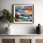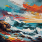 A dramatic seascape with crashing waves and a fiery sunset sky.