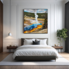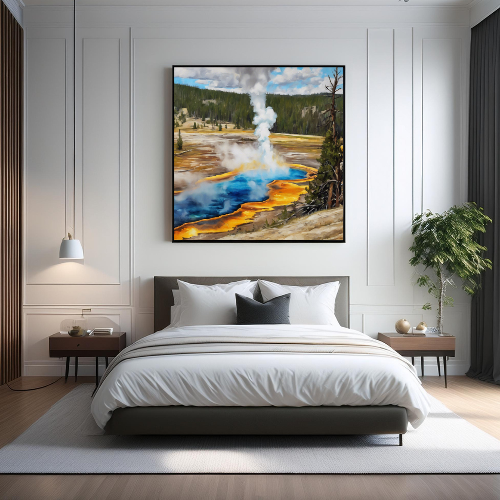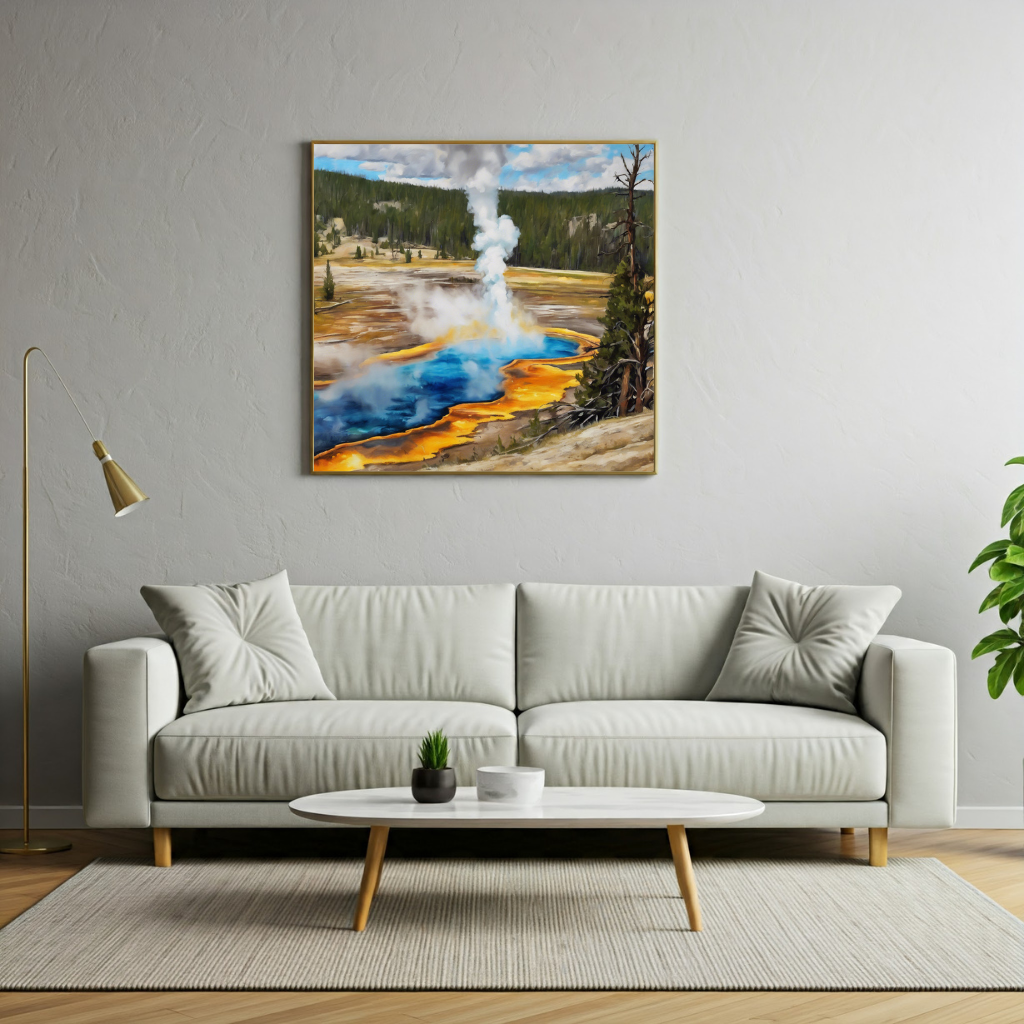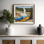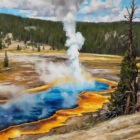 A geyser erupts in Yellowstone National Park, surrounded by vibrant colors.